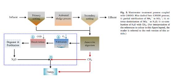 N2O是各種廢水生物脫氮過程中產(chǎn)生的副產(chǎn)物,也是一種極強(qiáng)的溫室氣體,造成了嚴(yán)重的環(huán)境風(fēng)險(xiǎn)。事實(shí)上,城市污水中N2O的可回收能量與一般的廠內(nèi)能耗(0.26~0.67 kWh/m3)相比幾乎微不足道。近年來,人們?cè)絹碓礁信d趣的是從廢水中回收N2O作為一種強(qiáng)大的燃料氧化劑。在這種情況下開發(fā)了好氧-缺氧-氮分解操作(CANDO)工藝,從厭氧消化液中回收N2O。基本上,CANDO過程包括三個(gè)操作步驟:(i)NH4+部分硝化為NO2-;(ii)NO2-部分反硝化為N2O,以及(iii)N2O與CH4共燃以回收能量。除了已經(jīng)確立的步驟3之外,實(shí)際上步驟1和2在大規(guī)模上仍然具有高度的挑戰(zhàn)性。因此,與傳統(tǒng)的生物脫氮工藝相比,CANDO工藝中生物脫氮的整體性能可能會(huì)受到影響。